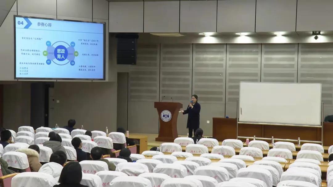胡珂菲老师以“启发、引领、认同”为题分享了自己在湖南省普通高等学校课程思政教学比赛中的参赛经验。胡老师首先介绍了2021年湖南省普通高等学校课程思政教学比赛的赛事概况、比赛形式与比赛内容。胡老师提出思政育人要坚定信念与认同感,思政点要契合课程特点、思维方法与时代特色,做到显性目标与隐性教育相融合。最后,胡老师就“语言学概论”进行了教学设计思路及内容阐释,并就“语言的接触——借词”一节进行了教学示范。