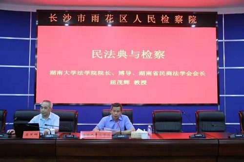 院长屈茂辉教授,为全体干警做“民法典与检察”专题辅导。讲座由雨花区检察院党组书记、检察长马贤兴主持,全体检察人员参加讲座。