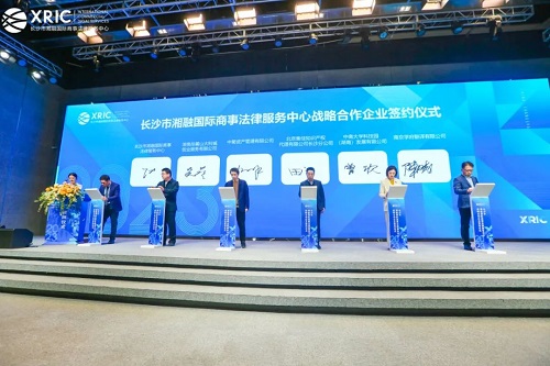 在揭牌仪式现场,长沙市湘融中心与湖南岳麓山大科城创业服务有限公司等五家企业代表共同签署合作协议,对长沙仲裁委员会、北京市京师(长沙)律师事务所、湖南云端律师事务所三个工作联系点进行授牌。