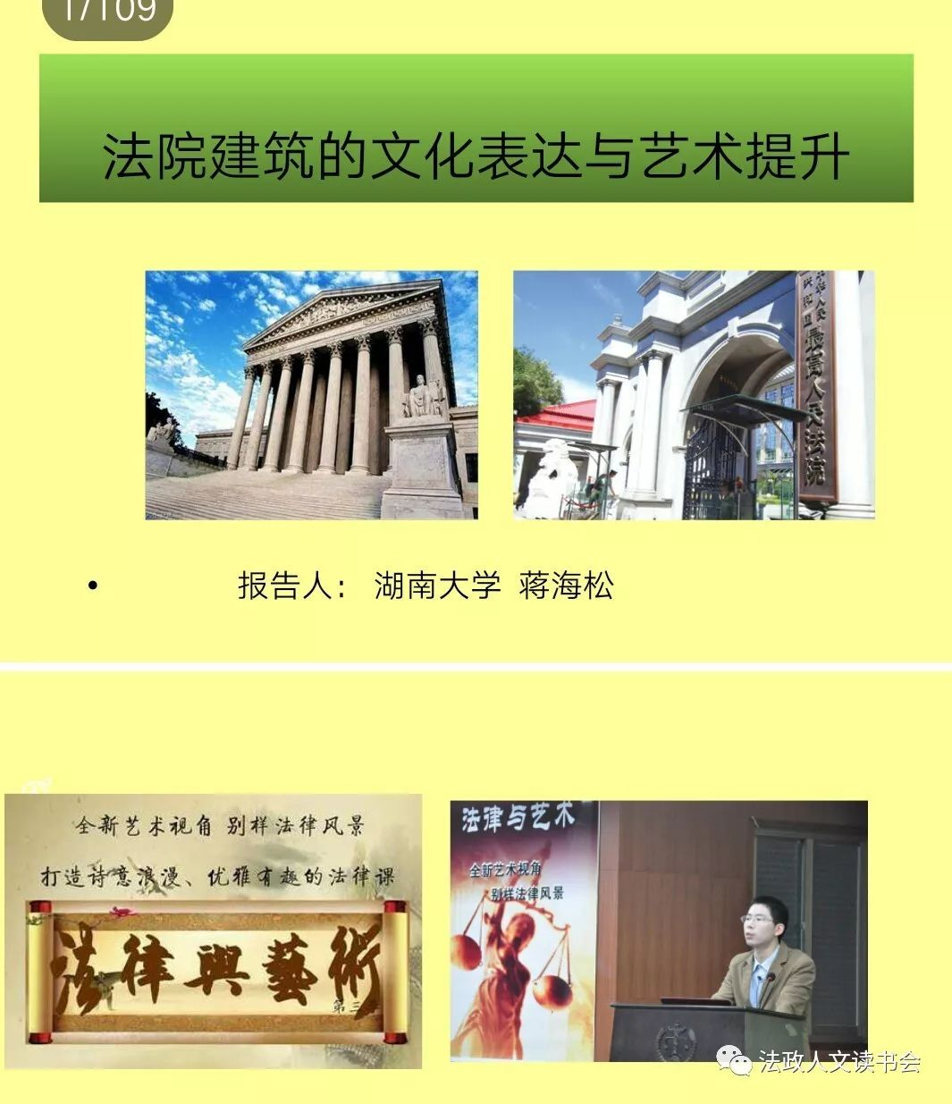浏阳法院院长李波从党建文化、法治文化、廉政文化三个方面向与会嘉宾介绍了浏阳法院的文化建设成果。在主旨报告环节,夏新华教授和蒋海松副教授分别作了题为《法院文化的理论辨析及体系建构》和《当代法院建筑的文化表达与艺术提升刍议》的主题报告。蒋海松在演讲中提出,建筑具有实用功能,保障人类安定,实现居有其屋。另一方面,建筑又具有美学意义,是一门综合艺术。 法律建筑是法律实用功能与艺术的完美融合。从功能上说,法院建筑是国家为行使审判权而设立的专用场所,而从文化上说,法院建筑更是传播法律精神、表达法律艺术、进行普法教育的重要空间。蒋海松提出,一个完美的法院建筑应该妥善地处理如下三组辩证关系,即:一、公共权威性VS亲和轻松感;二、区域功能化VS便捷灵活性 三、功能实用性VS 艺术象征性。浪子海松在演讲中图文并茂地呈现了上述三组矛盾,并分析当下中国法院建筑的常见弊病,并通过个案和他自己参与的一些设计对如何提升法院建筑的艺术性做了建议。报告引起听众的浓厚兴趣。