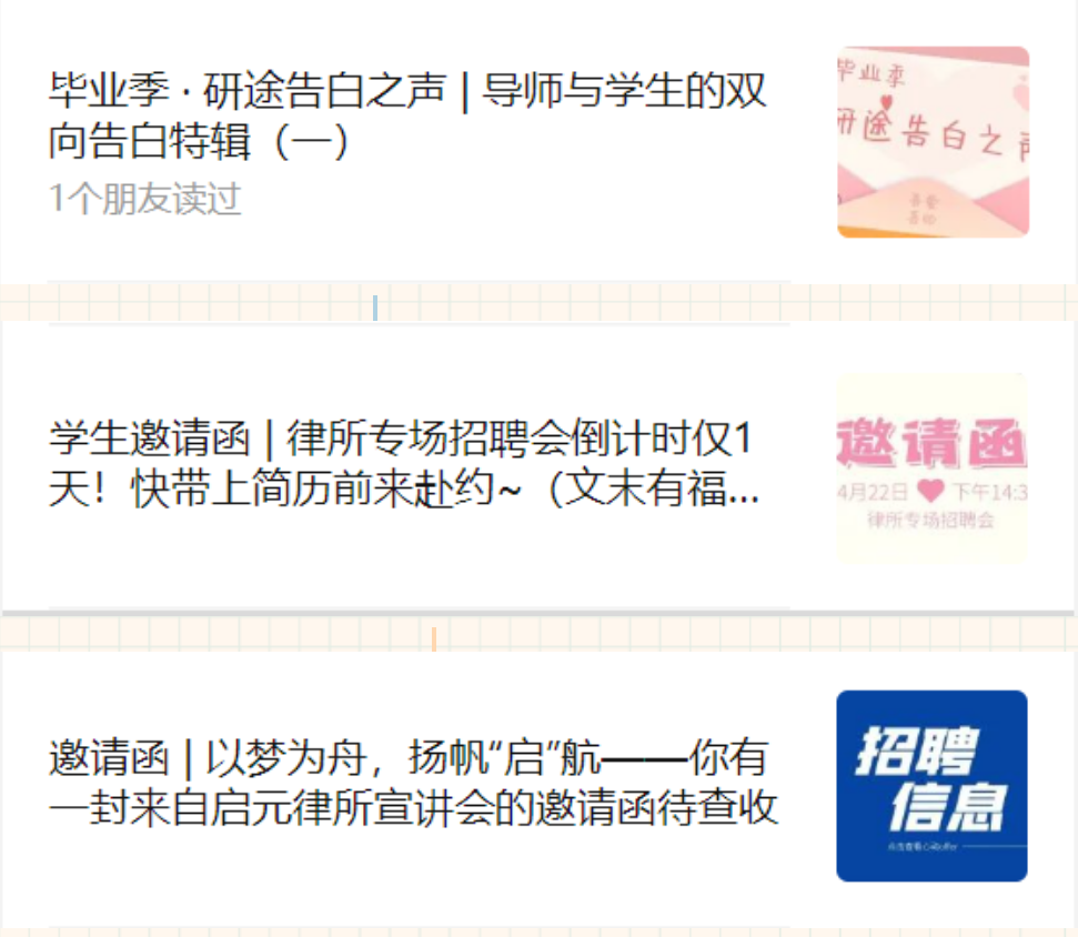 ️3.采访优秀律师校友与毕业生,为大家介绍不同领域的工作内容以及职业生涯遇到的困难和挑战,帮助同学们了解律师、公务员等职业发展前景,为之后就业做好充足的准备。