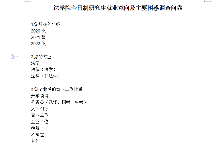 研究生就业意向及需求调查等。为了解新生的对学校的学习生活适应性情况,调研部在开学后设计并发布了针对2022级新生的调研问卷。通过调研问卷,了解同学们对于校园环境、生活服务、课程安排、学习压力等情况,有针对性提出解决方案,做好校园新生入学生活的过渡性指导。为了解学生对就业求职的需求,调研部设计并发布了针对律所招聘的调研问卷。通过调研问卷,了解同学们对于实习、求职目标、理想律所、理想业务等的要求,更好的与用人单位进行沟通。
