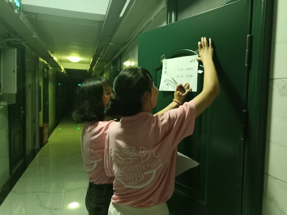 迎新团队成员为91论坛 的每一间新生寝室都粘贴上门签和致新生的一封信,信内记载新生常见问题注意事项和迎新团队成员的联系方式,团队成员还在新生的床铺上粘贴个人学号、姓名等信息,保证每一位新生都可以顺利地入住寝室。