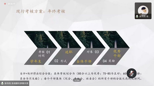 在干部培训中则采取理论与实践并重的形式,通过举办青年马克思主义培训班、与时事相关的主题讲座及各类主题活动促进部门间的交流与互动;新传院则在干部考核上有着更加严格完备的方式。