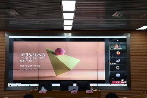 法律硕士的王迪同学以“不辞山路远,踏雪也相过——如何把握形势变化与及时调整心态”为主题,分享了她保研过程中遇到的问题与解决方法。她提出,在应对未知变化时,应提前做好准备;应时刻关注官方信息并及时理性做出选择;应准确认识自己并把握当前形势,及时调整心态和目标。