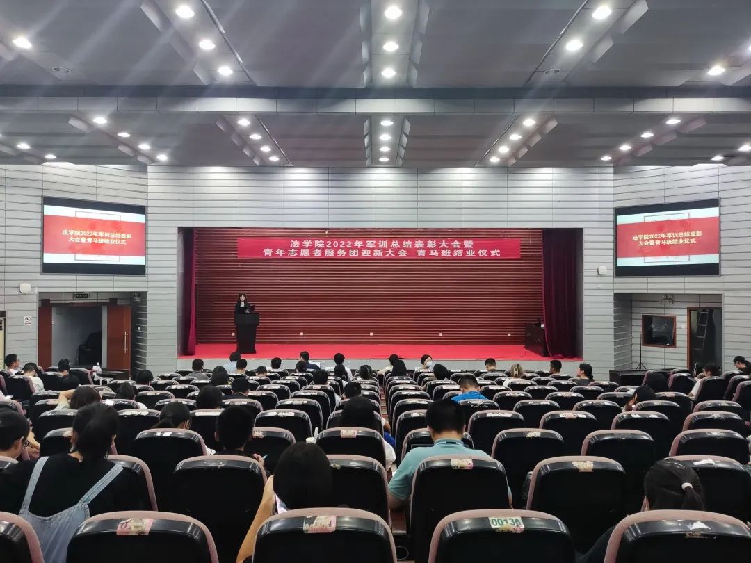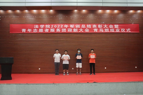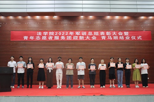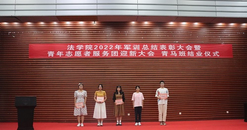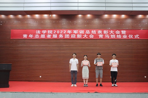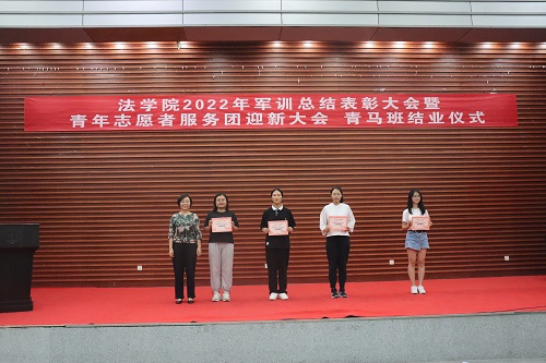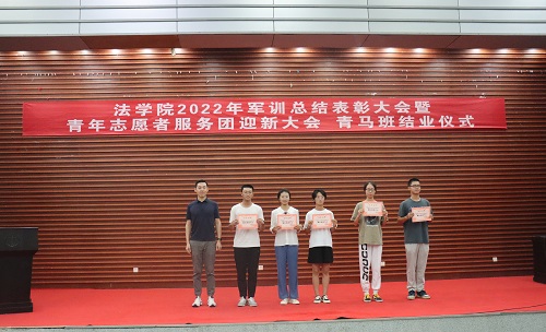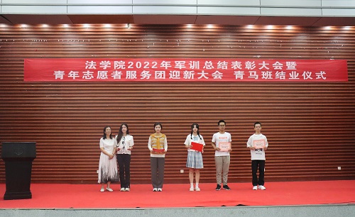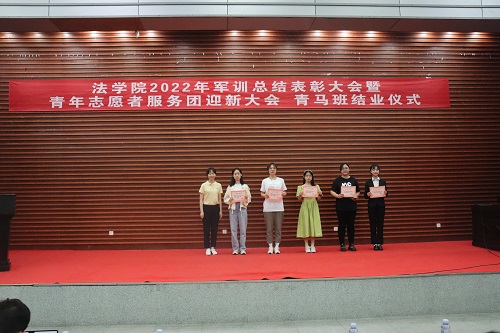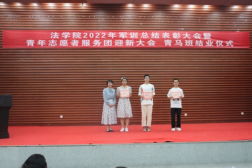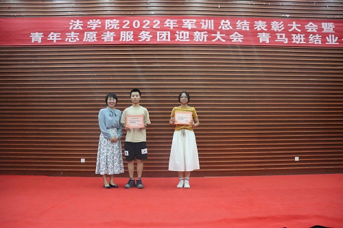 张丹老师宣读表彰决定。学院授予2022级法学三班、法学五班“军训优胜队列班级”荣誉称号,授予2022级法学一班、法学二班、法学四班“作风纪律先进班级”荣誉称号,授予天马一区三栋104寝室等十个寝室军训内务评比“优秀寝室”称号,授予刘亮、贾林远等十五人“军训先进个人”称号,授予姚睿婷、邓舒蔓等十人“青马班优秀学员”称号。学院还对参与2022级新生军训工作的迎新团队成员、91论坛