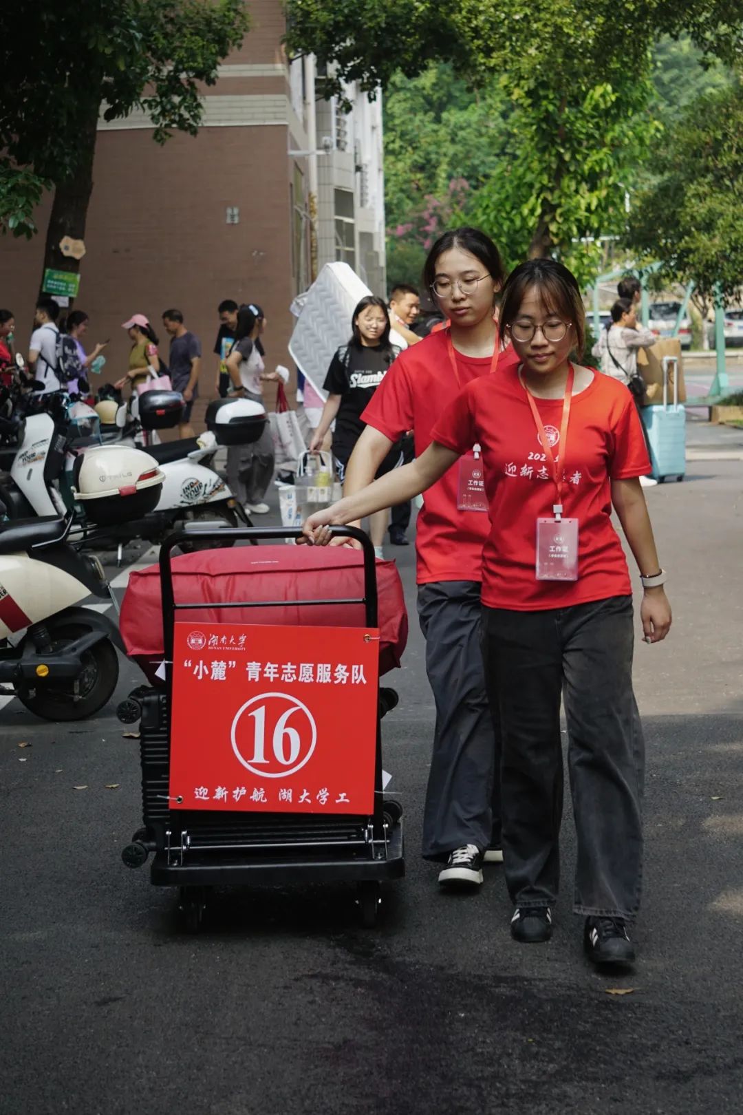 带着新生穿过校园,介绍周围的建筑,为他们答疑解惑,看到一双双闪烁着好奇与希望的眼眸,仿佛与一年前的自己重合。夏日炎炎,汗流浃背,但迎新志愿者们没有一丝一毫的懈怠,认真地完成搬运行李,引导报道等工作。迎新工作是忙碌的,更是幸福的,为新生们的朝气蓬勃所感染,因家长们的声声感谢而喜悦。