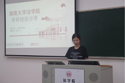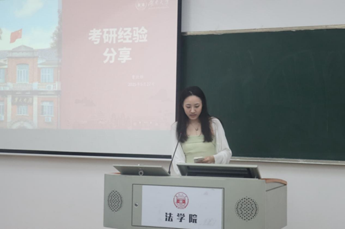 曾欣雅同学分别从“政治、英语、法律基础、法律综合”四个方面分享了考研经验。关于政治,她建议大家在前期应该系统刷一遍模拟题,也可以自己在微信小程序上搜索各个老师的预测卷辅助练习,后期把重心放在温习错题上。关于英语,她认为打牢词汇基础非常重要,鼓励大家选择适合自己的工具掌握词汇。在作文板块,她认为掌握一定的模板是有必要的,向大家推荐了一些博主的作文模板。此外,她认为网课学习并非必要,基础好的同学可以把精力放在词汇学习与刷题上。在刷题上,她建议大家最好限时完成题目,把握考试节奏。关于法律基础,曾欣雅同学从“课程学习、刷题、背诵”三个方面展开。在课程学习上,她推荐跟进学习一些线上课程,在听课时要注意及时搭建知识框架;在刷题方面,她认为部分机构的题目难度过大,若遇到这列题目,不必过分纠结;背诵方面,她建议尽早进入背诵阶段,这有助于后续的复习,以免出现来不及背诵知识点的情况。关于法律综合,她也建议在线上学习相关课程,同时搭配对应的习题巩固知识。此外,她还强调了法律综合的答题要求,要切实掌握专业知识,灵活运用,具体分析,不能生搬硬套。最后,曾欣雅同学以一句话结尾,鼓励大家:“种一棵树最好的时间是十年之前,其次是现在。”