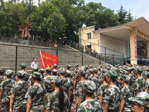 一声哨响,早上的训练任务圆满结束。教官和迎新团队成员按照排面将新生有序带到集合地点。经过一早上的训练,同学们稍有疲惫,但听到集合的命令后立即调整好立正的姿势,个个姿势端正,精神振作。“同学们好,大家军训辛苦了,我代表学院全体老师来看望大家,希望大家一起努力,顺利完成军训任务。”李书记在同学们集合完毕后发表了简单而热情洋溢的讲话,他鼓励参训的新生要团结紧张,严肃活泼,努力完成军训任务,并对全体迎新团队成员和新生辅导员表示亲切慰问。