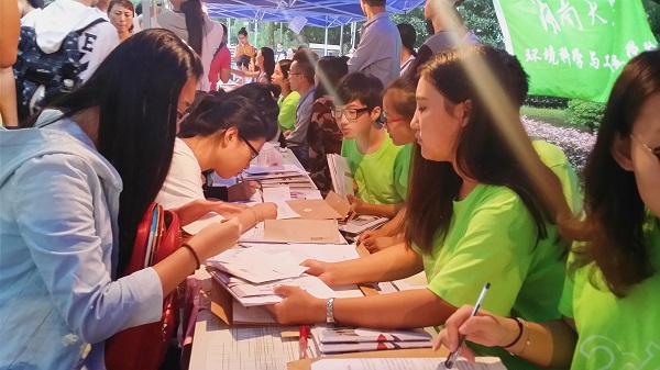 迎新团队成员就在本科新生辅导员杨凯老师的带领下前往迎新点布置场地。经过半个小时的布置,迎新接待点整齐有序,各个标志清晰可见,全体迎新团队同学和志愿者整装待命。随着第一辆接送新生和家长的校车驶入东方红广场,志愿者们高举工作牌,热情守候在校车旁迎接2016级新同学。迎新接待点的工作人员仔细核对新生信息,为新生办理入学手续并发放校园卡、《新生手册》、《致家长的一封信》等材料。负责报到注册的志愿者耐心地为新生答疑解惑,带领新生到复临舍注册和缴费,并将新生送至天马园区。早在天马园区等候的新生班主任热情地带领新生领取卧具与军训服装,帮助他们搬运行李、安顿宿舍、解答问题。志愿者们携着清晨的第一缕晨光出发,直至凌晨太阳的又一次升起,都能看到他们忙碌的身影,微笑和热情始终是他们的最富年轻活力的徽章。向参与此次迎新的全体志愿者和迎新团队的成员致敬!