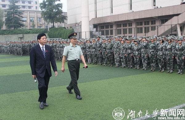 校党委书记刘克利同志在武装部副部长戴谋元同志的陪同下检阅参训方阵