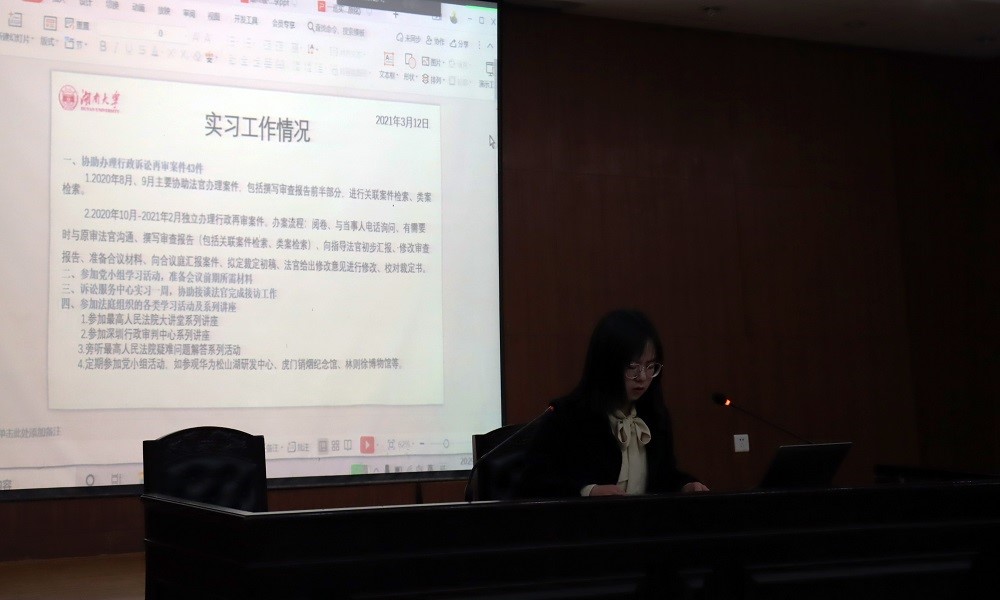 第四位分享实习经验的是唐智灵,她也从实习情况、团队合作模式、民申案件审理思路、实习感悟四个方面分享了自己实习以来的心得体会。唐智灵最后分享了她实习后的三个思考内容:注重思维差异,明确定位;重视案例,避免空想;注重基础理论与法律思维。