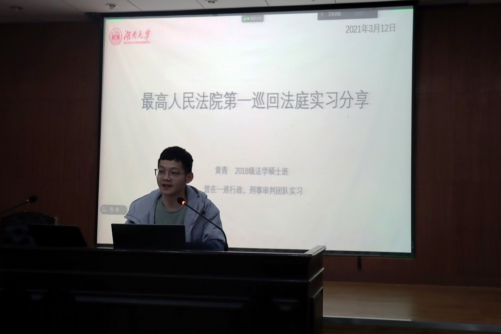 第一位分享实习经验的是黄青。黄青迄今共协助法官助理办理了61件行政再审案件、1件刑事申诉复查案件,其日常具体工作内容为在进行法律检索、文献综述、类案研究的基础上,撰写审查报告、与法官助理讨论、向合议庭汇报以及草拟裁判文书等。黄青从四个方面详细讲述了在实习过程中的心得体会。首先他提到了在事实认定方面如何采信证据的问题;随后谈到了在法律适用方面如何解释分歧的问题;之后讲述了在诉讼服务观摩时如何面对诉讼当事人不服的情绪的问题;最后他总结了实习以来的切身感受。