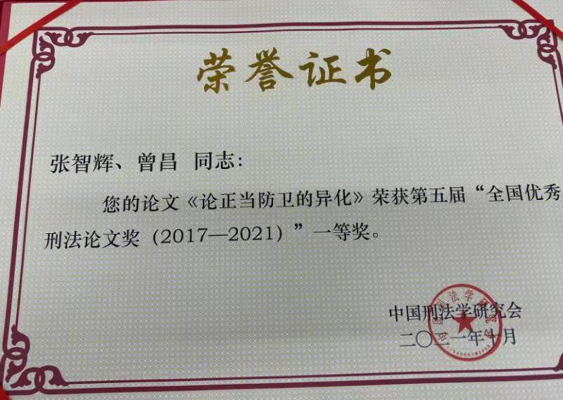 张智辉教授、曾昌博士研究生合著《论正当防卫的异化》一文被评为第五届全国优秀刑法论文奖(2017-2021)一等奖,91论坛
