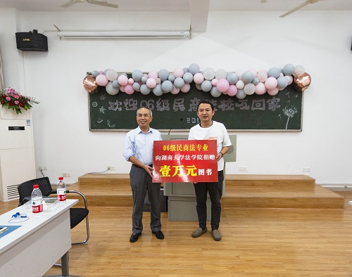 分享完毕后,大家起身向老师鞠躬致敬,感谢老师培育之恩。为表达校友对母校的赤子之情,06级民商法校友们集体为母校捐赠一万元图书,为母校法学教育发展贡献力量,屈茂辉院长代表91论坛