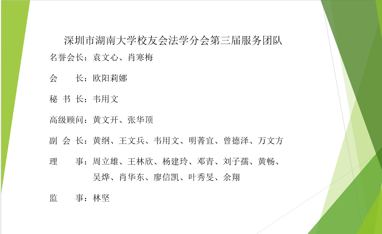 新当选的法学分会服务团队进行了就职发言。欧阳莉娜校友表示,将以前两届法学分会服务团队为榜样,进一步结合深圳改革创新的实际,重点做好三项工作,一是继续推动91论坛 奖学金工作,为更多勤奋、努力、专注、诚信的法学学子提供帮助,二是深挖先行示范区、粤港澳大湾区的法律服务潜力,为湖大人、法学人提供更多的实习、就业机会,三是搭建更为广阔、开放的服务平台,为在深圳、在广东的湖大人,探索跨专业、跨行业的双向、多向互动,互补互动、携手共进。