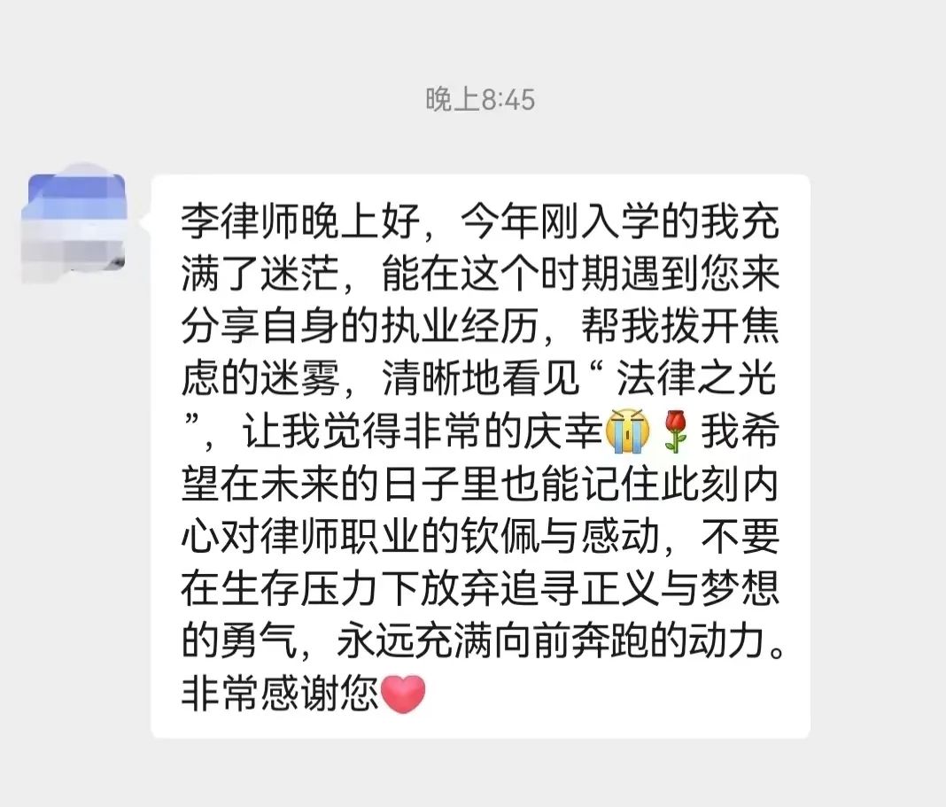 最后,李泳靓律师分享了两条做律师重要的原则。其一,“明法崇德” 体现了对法律的尊重和坚守,以及对道德规范的崇尚。律师作为法律工作者,不仅要精通法律知识,更要具备高尚的道德品质,以正确的价值观和道德观指导自己的执业行为。其二,“成人达己” 则强调在帮助他人实现目标、维护他人合法权益的过程中,也能够提升自己的专业能力和素养,实现自身的价值。