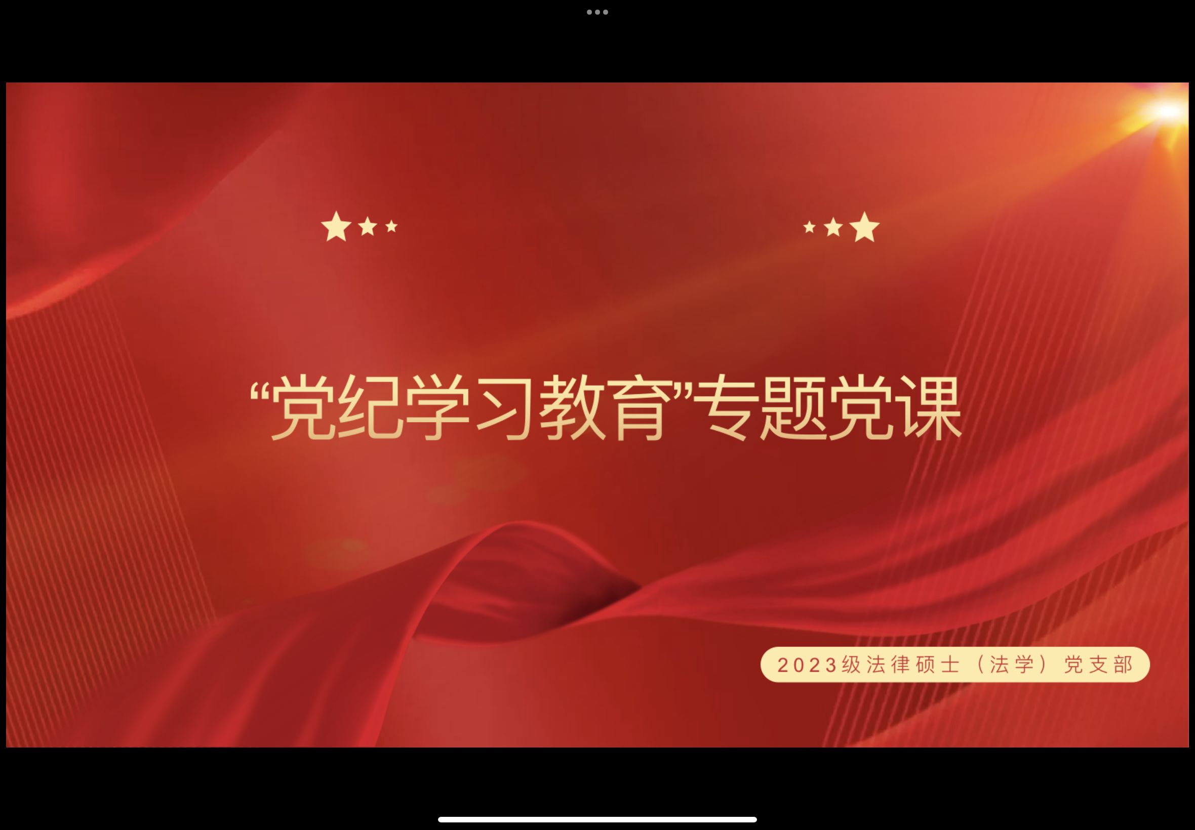 2023级法律硕士(法学)党支部于2024年6月11日在线上召开了一次党纪学习教育专题党课,旨在深入学习贯彻党的纪律要求,加强党员的党纪教育和党性修养。党课上,支部书记首先强调了党纪学习教育的重要性,指出党纪是党的生命线,是全体党员必须严格遵守的行为准则。随后,详细解读了《中国共产党纪律处分条例》的相关内容,通过典型案例的分析,让党员们深刻理解了党纪的严肃性和权威性。在学习的过程中,党员们纷纷表示,要将党纪学习教育成果转化为实际行动,时刻保持清醒头脑,坚守党的纪律底线。他们积极发言,分享自己的学习心得和体会,并就如何在日常生活中更好地遵守党纪、发挥党员先锋模范作用进行了深入讨论。此次党纪学习教育专题党课的召开,不仅提高了党员的党纪意识和党性修养,也进一步增强了支部的凝聚力和战斗力。党员们一致表示,将以此次党课为契机,不断加强自身学习,严于律己,争做合格党员,为党和人民的事业贡献自己的力量。