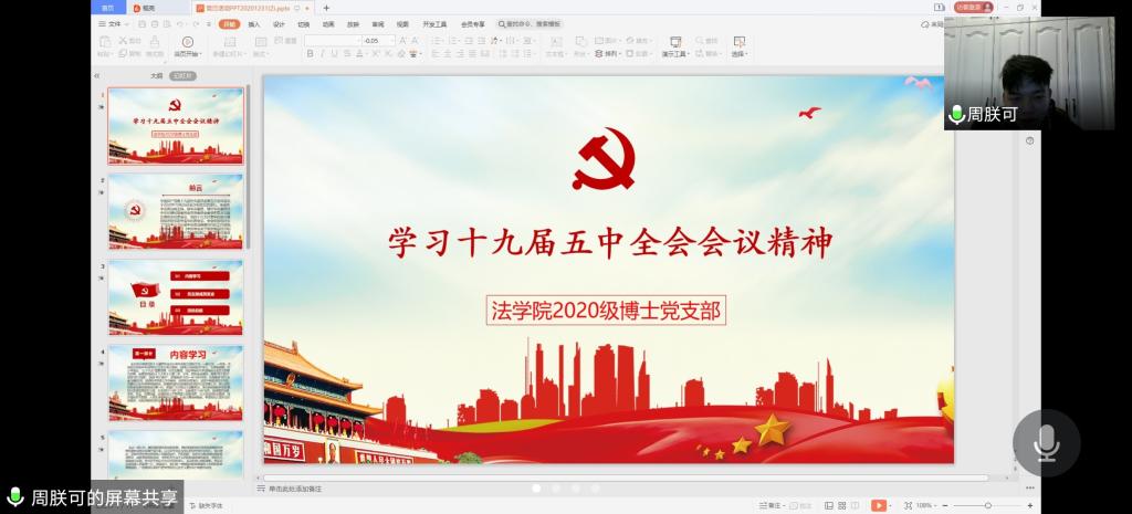 随后同志们就会议内容积极发言,支部书记蒋昊君同学说到:十九届五中全会对正在进行环境法专业学习的我来说意义重大,会议提成了推动绿色发展,促进人与自然和谐共生。坚持绿水青山就是金山银山理念,坚持尊重自然、顺应自然、保护自然,坚持节约优先、保护优先、自然恢复为主,守住自然生态安全边界。和我导师一直强调的“赞天地之化育”十分契合,也使我更坚定了自己的学习方向。紧接着,黄雪同学也发表了自己的看法:学习十九届五中全会精神,使我更深刻地理解了依法治国要义与追求。当下司法改革的核心要义之一是使得人民群众在每一个案件中真切地感受到司法的公平与正义,实现法律效果、社会效果、政治效果的有机统一。2017年最高法发布了《人民法院办理刑事案件第一审普通程序法庭调查规程》、《人民法院办理刑事案件庭前会议规程》、《人民法院办理刑事案件排除非法证据规程》(简称“三项规程”),进一步强调了事实认定的重要性。准确裁判有赖于准确的事实认定,其彰显的是法律共同体的智识理性。每一个裁判都形成于特定的社会结构之中,同时又反哺社会,以其合理性与正当性构筑司法公信力。换言之,准确地进行事实认定,其意义不止于实现个案正义,更关乎获取普遍正义。