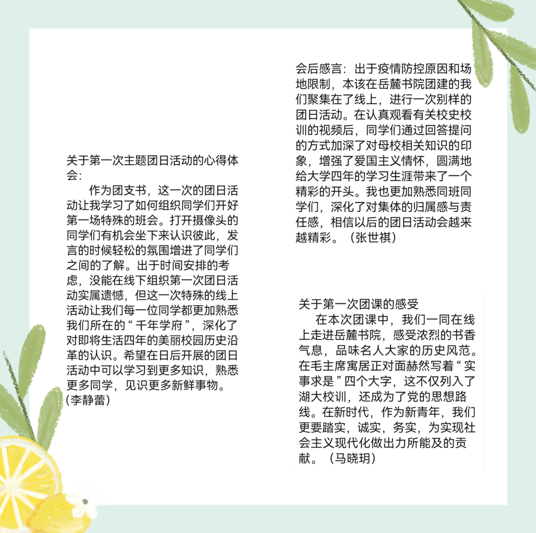 在问答环节,班长刘亮同学率先作答,准确回答出“朱张会讲历史”等问题,其他同学亦踊跃参与并流利作答,体现了同学们对校史的熟悉,对校园的热爱以及对学术的热情。会后,同学们就本次团日活动抒发了自己的心得与感想。张世祺同学认为:“本次团日活动增强了同学们的爱国主义情怀,深化了对集体的归属感与责任感,为四年的大学生活带来了精彩的开端。”马晓玥同学表示:“作为新时代的新青年,我们更要踏实、诚实、务实。为实现社会主义现代化做出力所能及的贡献。”