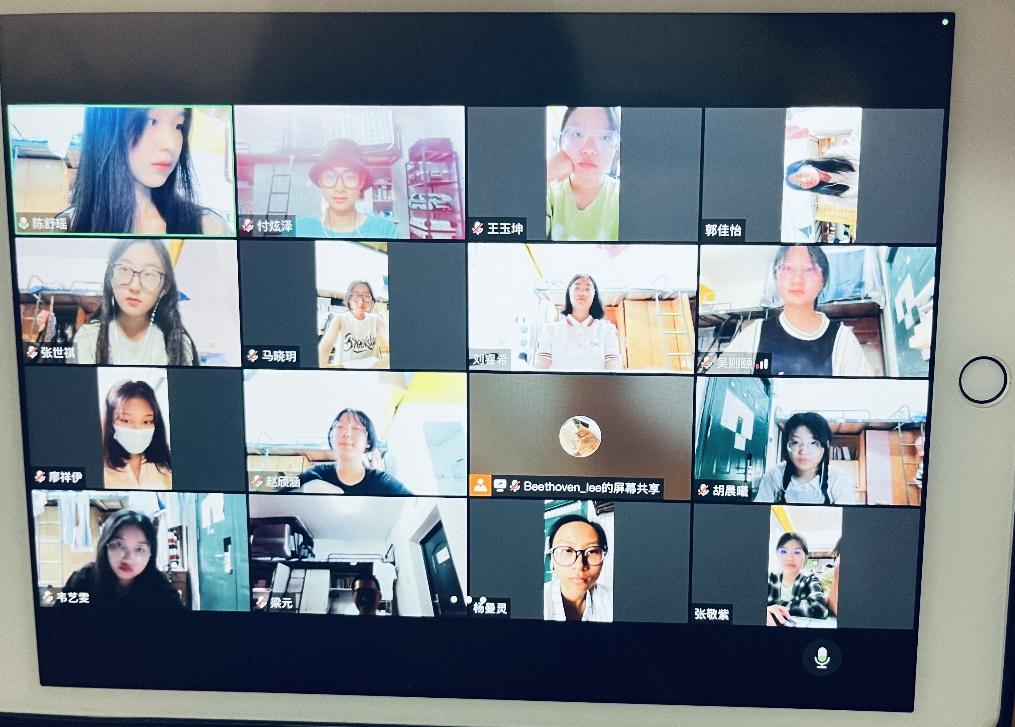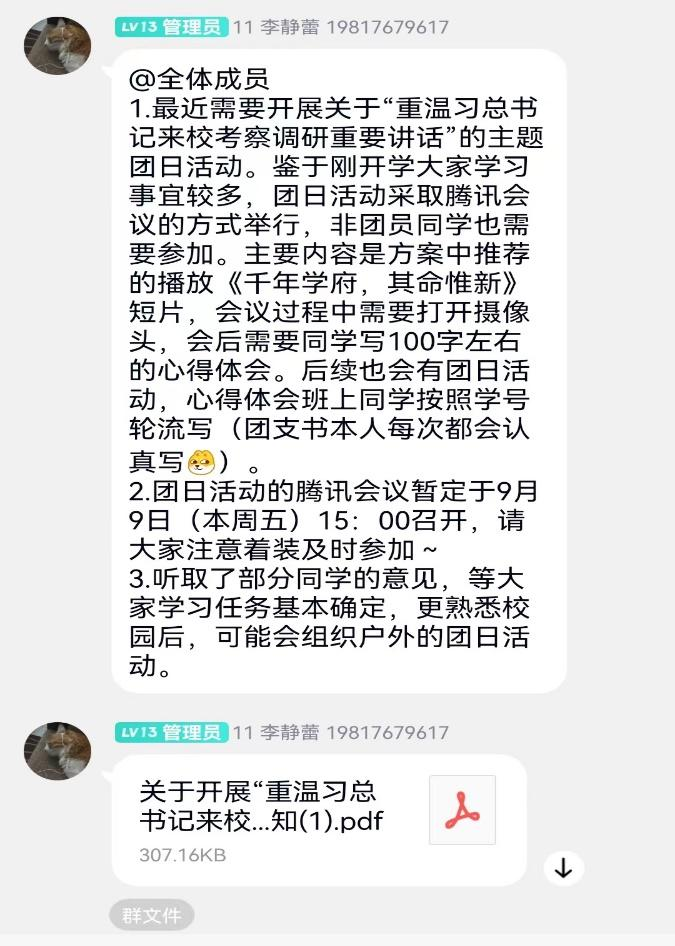 经班委会讨论决定,本次团日活动以召开线上会议,播放《千年学府,其命惟新》短片并进行讨论发言的形式开展,会议由班级团支部书记李静蕾同学主持。