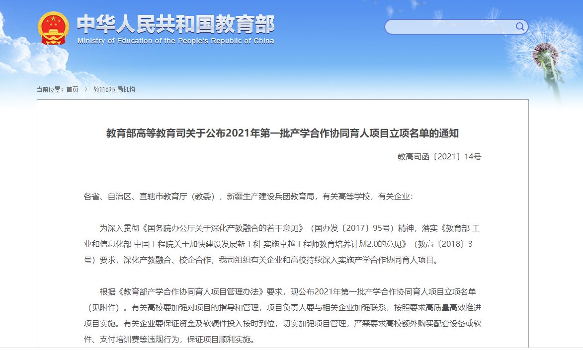 日前,教育部发布了《教育部高等教育司关于公布2021年第一批产学合作协同育人项目立项名单的通知》(教高司函〔2021〕14号),91论坛