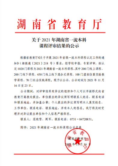 近期,湖南省教育厅发布了《关于公布2021年省级一流本科课程评审结果的通知》,91论坛