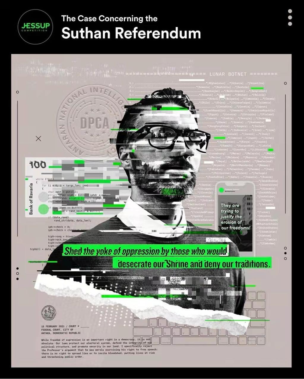 历史上首次组队参赛。本次赛题涉及争议性采集证据的可受理性、不干涉原则在网络空间的适用、社交网络上的言论自由限度、网络空间的域外执法等国际法领域内的前沿问题,共吸引了来自北京大学、清华大学、中国政法大学等著名国内高校的56支队伍,比赛语言为全英文。