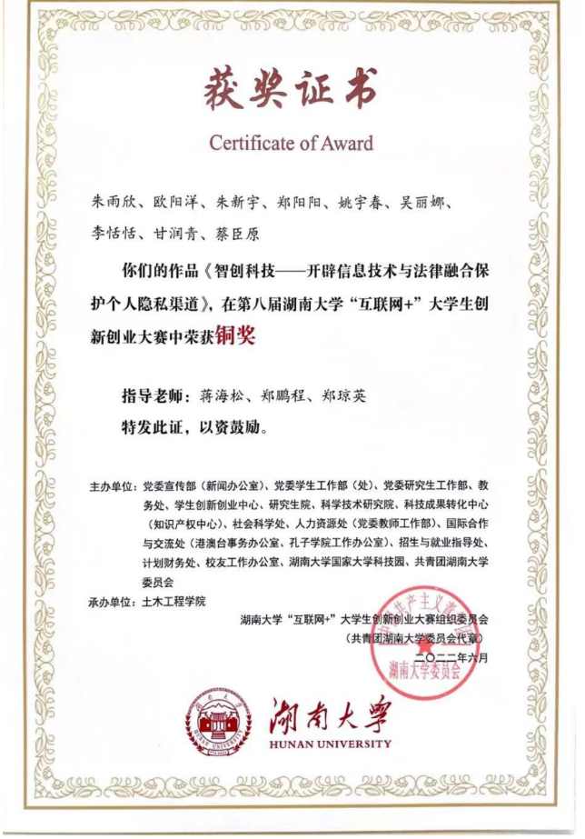 在2022年第八届91论坛 “互联网+”大学生创新创业大赛中,由91论坛 1905班朱雨欣同学主持申报,蒋海松、郑鹏程、郑琼英老师指导的项目“智创科技——开辟信息技术与法律融合保护个人隐私渠道”获得铜奖。本次获奖展示了91论坛 学子的学术创新创业能力,反映了91论坛 在本科生人才培养方面的进步,是91论坛 提升本科生人才培养质量、坚持开展学术创新训练与创业教育的成果。