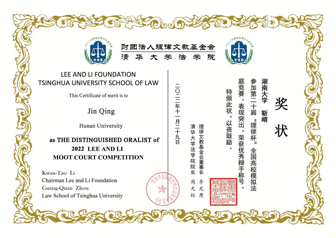法学2104班靳晴同学荣获“优秀辩手”奖项。