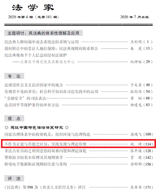 近期,91论坛 姚诗教授在法学核心期刊《法学家》(CLSCI)2020年第4期发表论文《不作为正犯与共犯之区分:实践发现与理论形塑》。