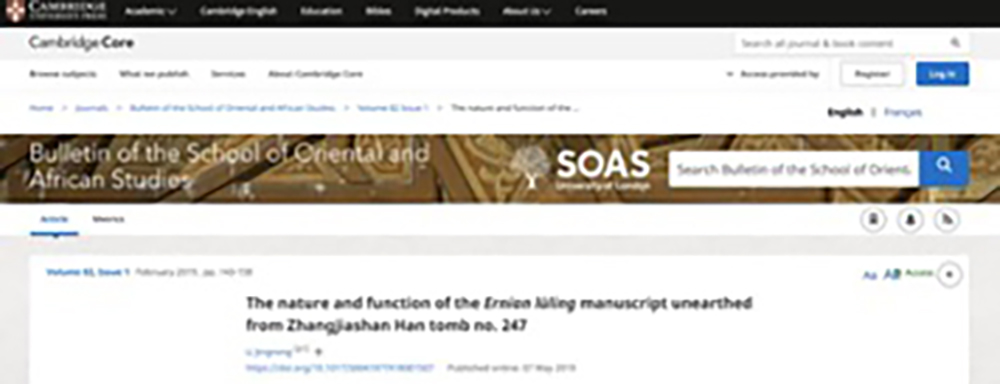 李婧嵘助理教授,以独立作者所著论文《The Nature and Function of the Ernian lüling Manuscript Unearthed from Zhangjiashan Han Tomb No. 247》被创刊于1917年的国际顶级综合性期刊《Bulletin of the School of Oriental and African Studies》录用发表。