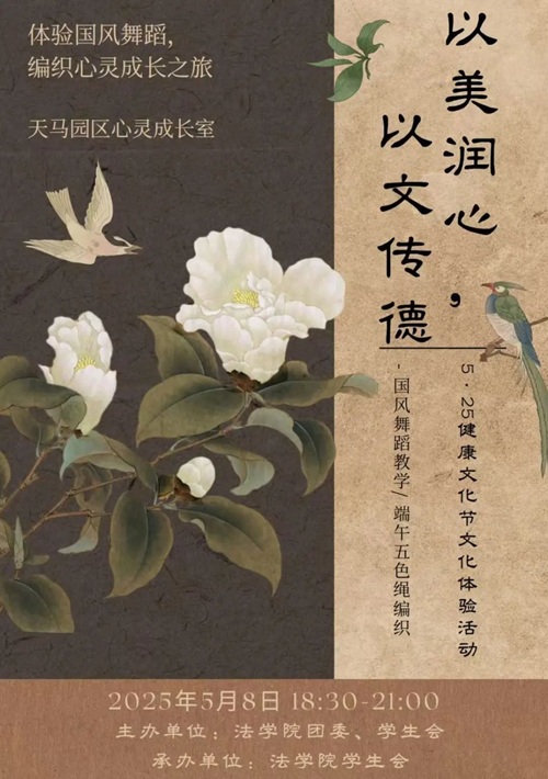 在高强度、快节奏的工作与生活中,不要忘记给自己的身心充充电。在这里,你不仅能够学习营养知识,搭配科学菜谱,还能领略传统舞蹈的优雅韵律,亲手编织五色绳,感受指尖上的文化传承。无论你是喜欢减脂塑体,还是钟情于传统文化,或是热爱舞蹈艺术,都能在这里找到属于自己的舞台。让我们相约5·25心理健康活动节,以体铸魄、以美润心、以文传德,共同度过一段充实而愉悦的时光吧!