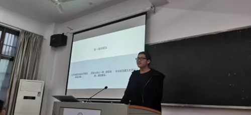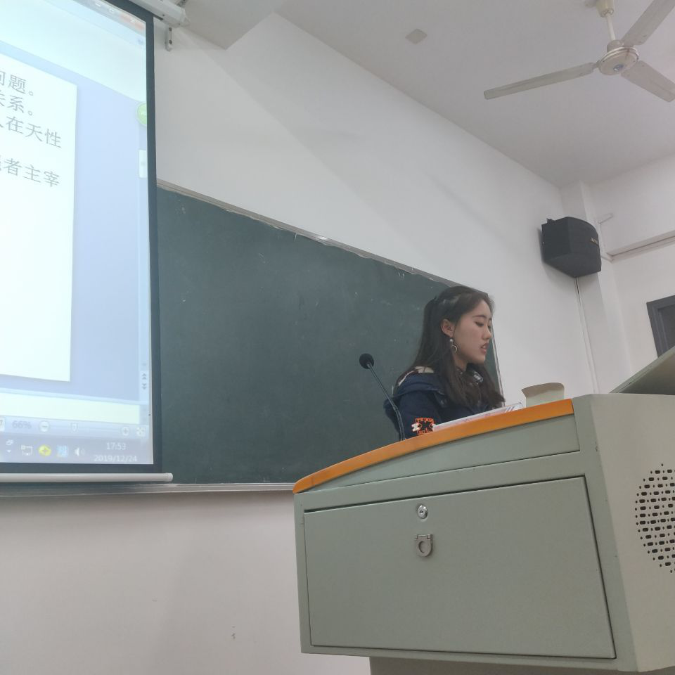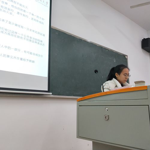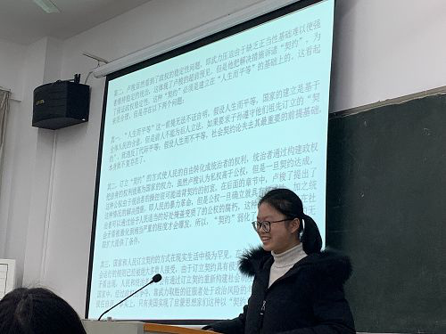 1904班的刘磊同学,以独特的角度阐释了自己对卢梭及《社会契约论》的看法,他提出人生而是自由与不自由的结合体、人生而平等,他们有的,我们都有、会秩序需要建立在契约之上等观点,并就观点中的相关问题和同学们进行了讨论。
