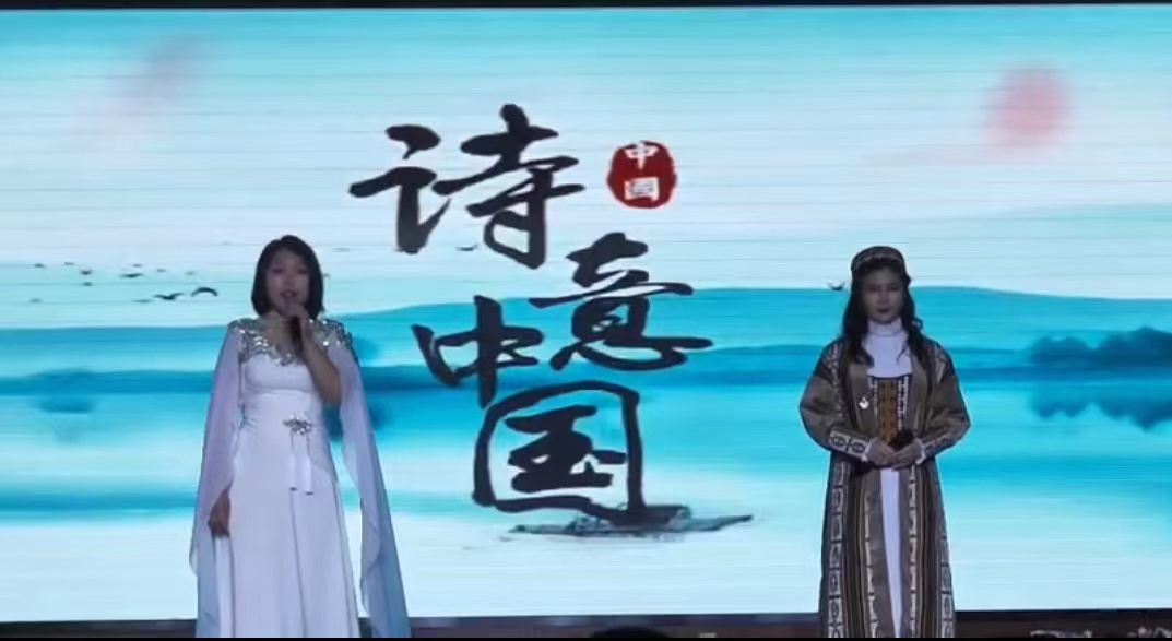 乌丽凡·叶尔江同学邀请到2204班张骋同学作为助演,带来诗歌朗诵《诗意中国》,体现了五十六只花船共映辉煌,中华民族心连心一同砥砺前行在新时代的征程上。