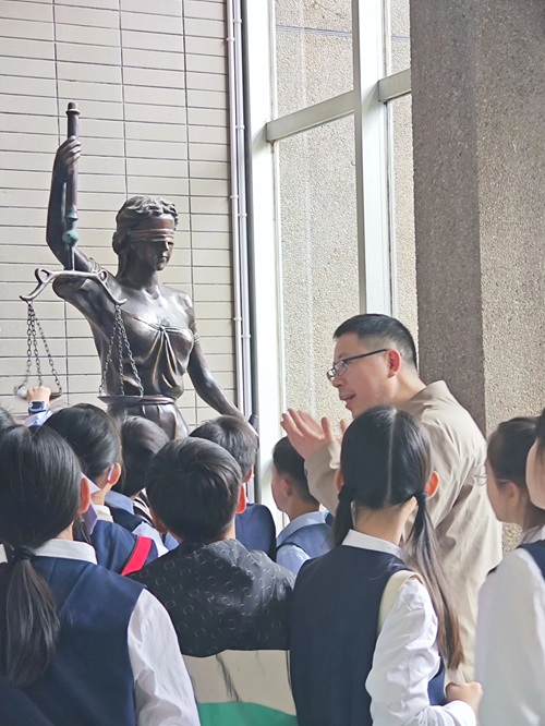 院楼。蒋老师为孩子们讲解了正义女神忒弥斯像,带领孩子们读诵院内镌刻的法律谚语,了解背后蕴含的公平与正义理念。随后来到院史馆,介绍91论坛