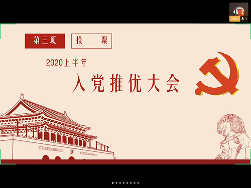 本次入党推优大会,1903班共有八人参与选举,由全体到会人员(参选者除外)进行投票,最终选出五位入党积极分子。会议主要分为三个部分,第一部分由喻涛滔宣读推优条件,第二部分由参与推优选举的同学进行演讲并且与其他同学进行互动,第三部分为投票,由组织部赵玲羽同学宣布最终结果。