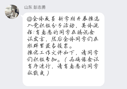 竞选同学发言完毕后,在团支书彭志勇和组织部赵玲羽同学的组织和监督下,同学们利用社交平台进行线上匿名投票。根据最终票数统计结果,陈晨、项筱涵、汪欣竹三名同学被顺利推选为入党积极分子。