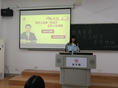 考察时的讲话精神,全体与会同学一同观看了习近平总书记的考察,讲话视频。习近平总书记提出希望同学们不负青春、不负韶华、不负时代,珍惜时光好好学习,掌握知识本领,树立正确的世界观、人生观、价值观,系好人生第一粒扣子,走好人生道路,为实现中华民族伟大复兴贡献聪明才智。同学们对习总书记的话语深有感触,并纷纷对此发表自己的感言。于思媛同学认为,作为青年,在多重思想影响下的我们正处于摇摆不定的阶段,习总书记提出的系好人生第一粒扣子为我们明确了未来的发展方向,在此阶段,我们应充分利用好时间与学校资源,好好学习,在未来成为实现中华民族伟大复兴的主力军。