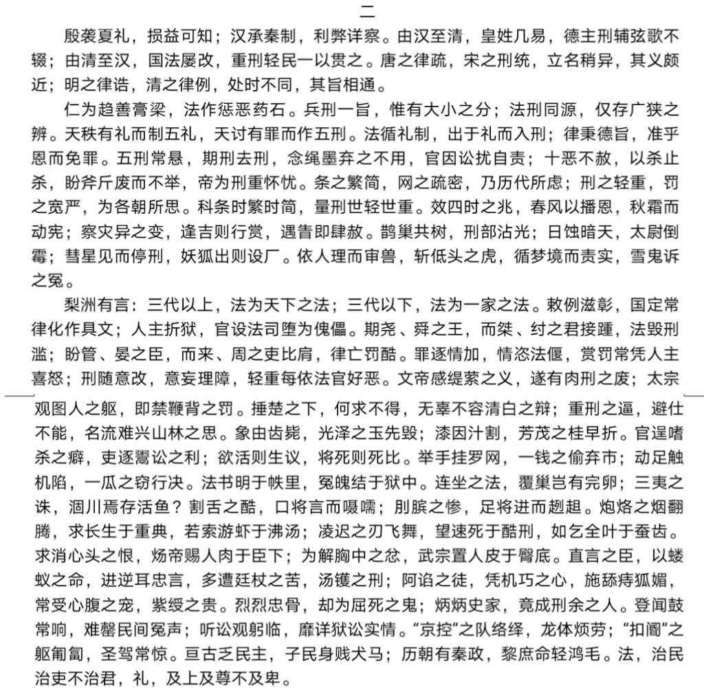 就这一段的内容而言,主要是谈论古代法制的残酷,在这一时间段,法主要以罚为内容,其规范功能不及上层社会,对下层人员美其名曰规范,实则是剥削和压榨的保证。扮演现代法律作用的礼实际上对于底层人民也是遥不可及的。如文中所言“法,治民治吏不治君,礼,及上及尊不及卑。”所谓的法是上层大人物实行强权的手段和保障,所谓礼是上层社会的游戏。