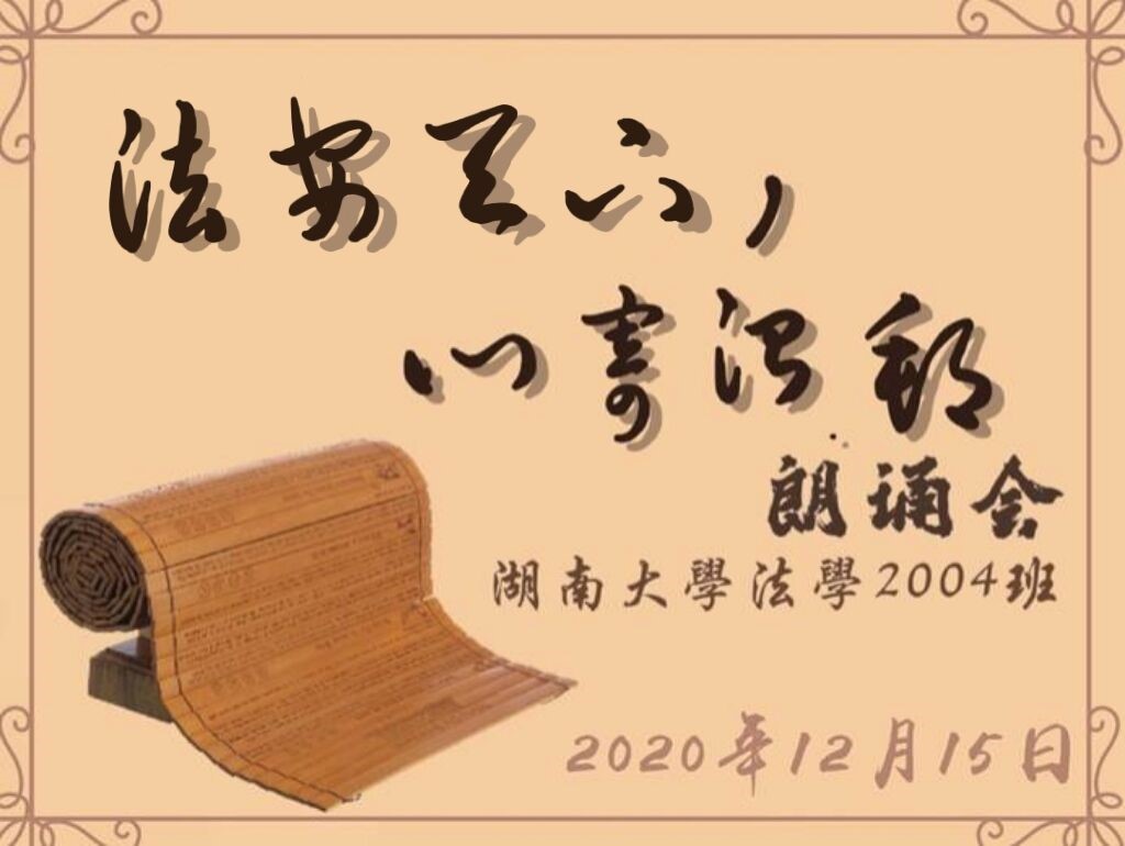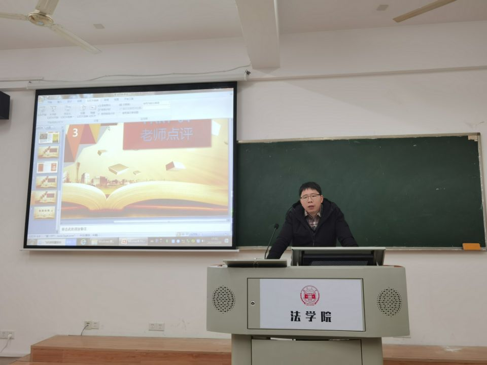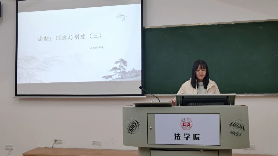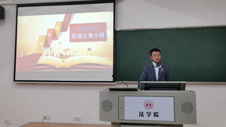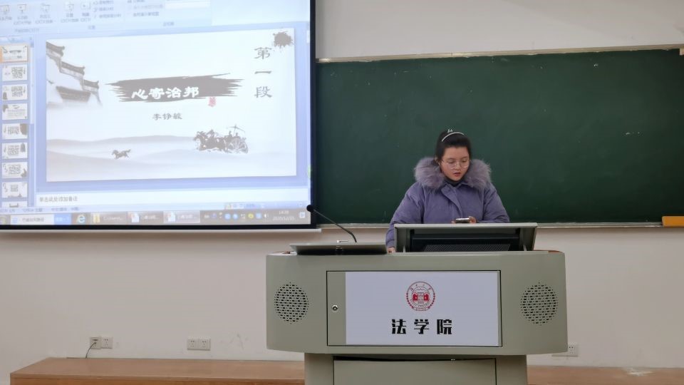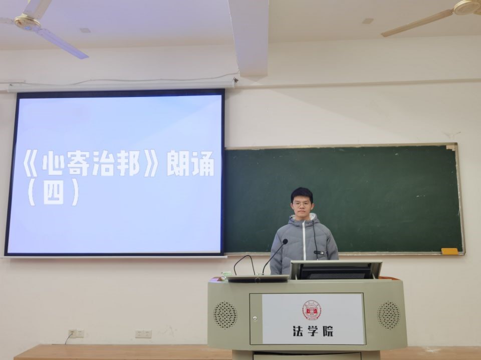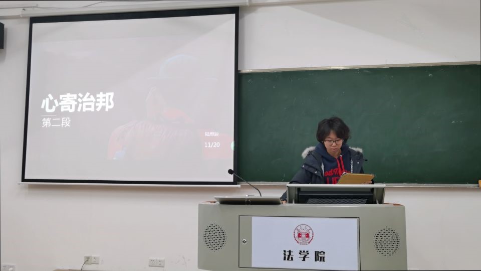 304教室举行了第一次法律朗诵会。法学2004班班主任、法理学授课导师蒋海松副教授担任讲评老师。法学2004班学习委员杨仁担任主持人。李铮毓、陆思辰、周绍华、林俊毅共四位同学担任朗诵者;石超、潘霖、古丽白克热、黄诗香共四位同学担任评论人。本次朗诵会主题主要是对当代法学名家高鸿钧先生的名篇《心寄治邦》进行解读,这是一部对中国上下五千年法律史归纳总结的著作。主持人杨仁简短介绍了《心寄治邦》的作者概况和外界评价后,读书会正式开始。