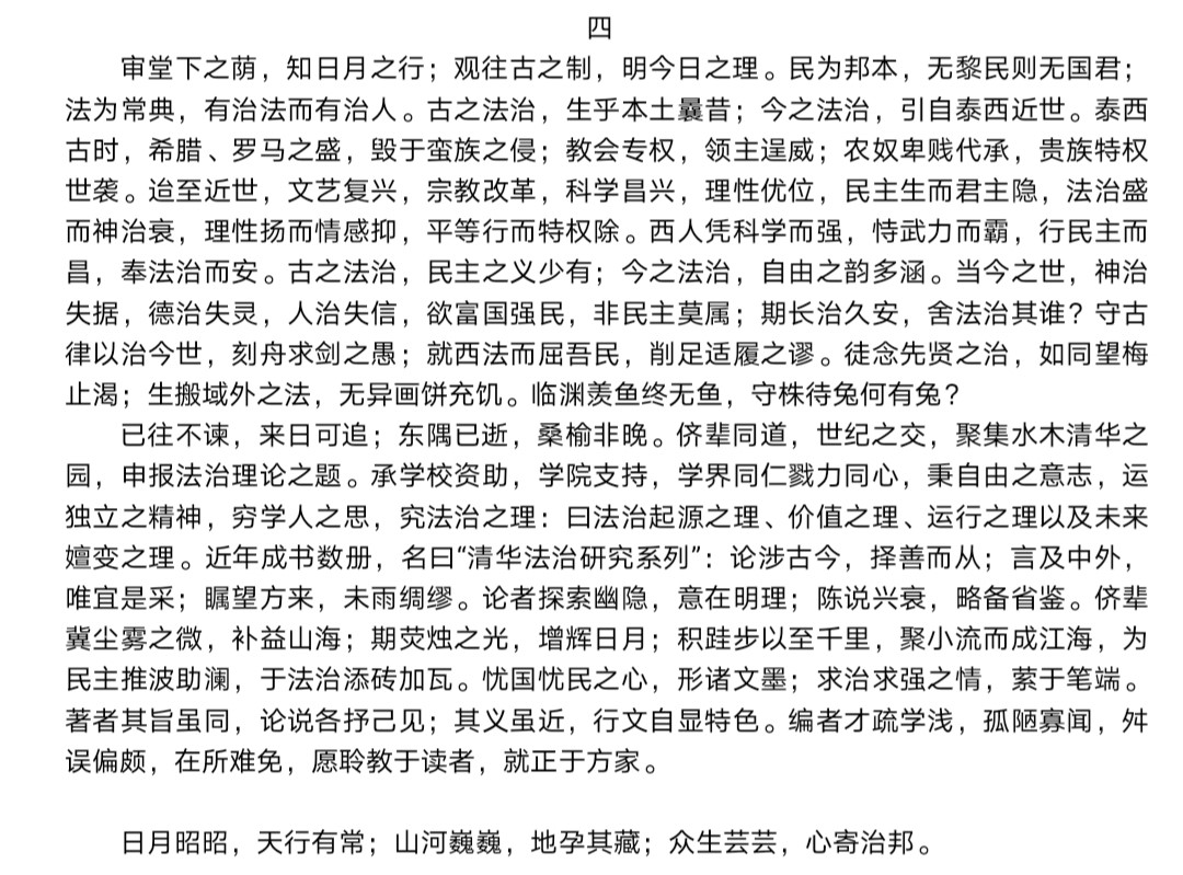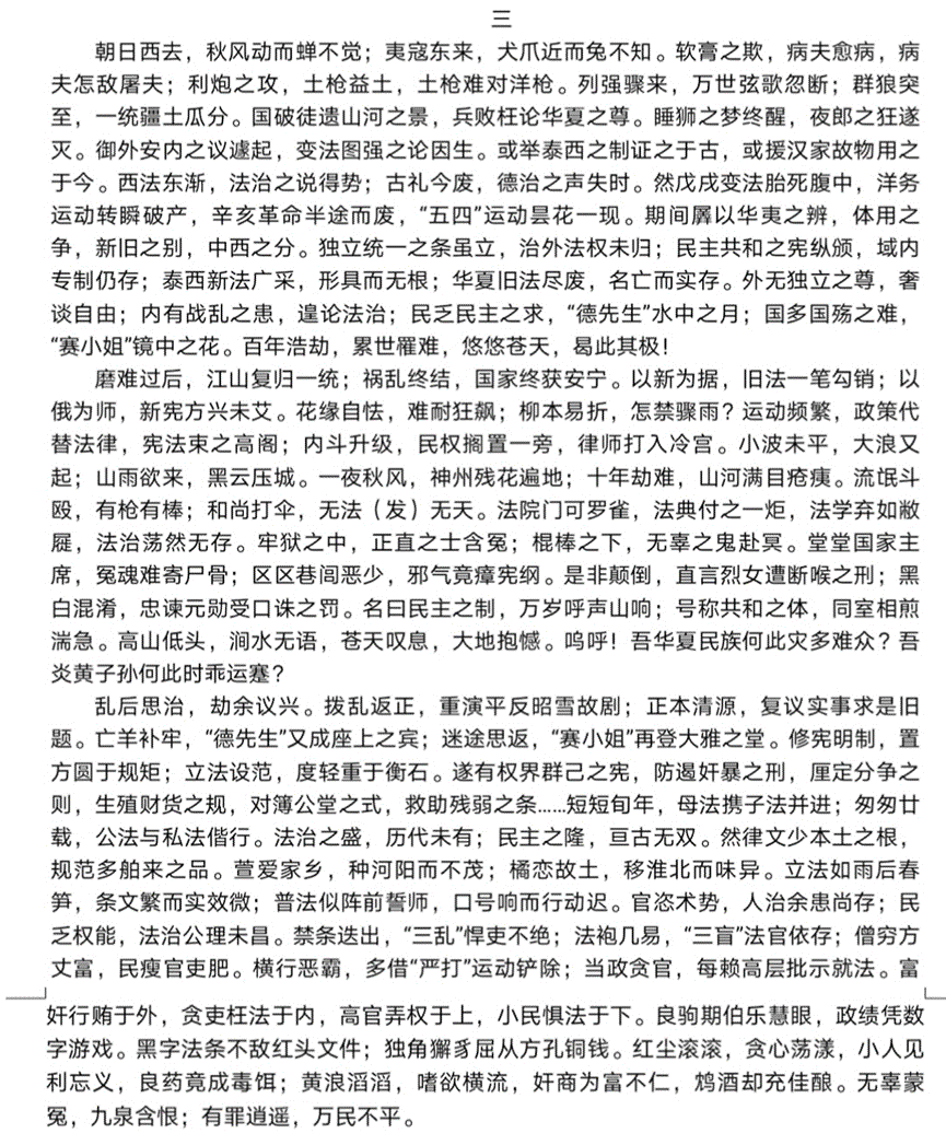 在最开头的两句中,作者以朝日西去对应了我国清朝已不复当年繁华,从前的世界文明的最高点已经沦于落寞的现实困境。而夷寇东来则对应了清朝末年西方国家开始侵略我国的悲惨事实。也透露出了一国若无法治终究会被时代所抛弃的事实。接着作者以简短的语言讲述开来我国近代学者对法治的探索:“御外安内之议遽起,变法图强之论因生。或举泰西之制证之于古,或援汉家故物用之于今。西法东渐,法治之说得势;古礼今废,德治之声失时。”这表明了我国社会向法治转变,虽然这些运动失败了,但是也为我国法治化发展提供了可能性。