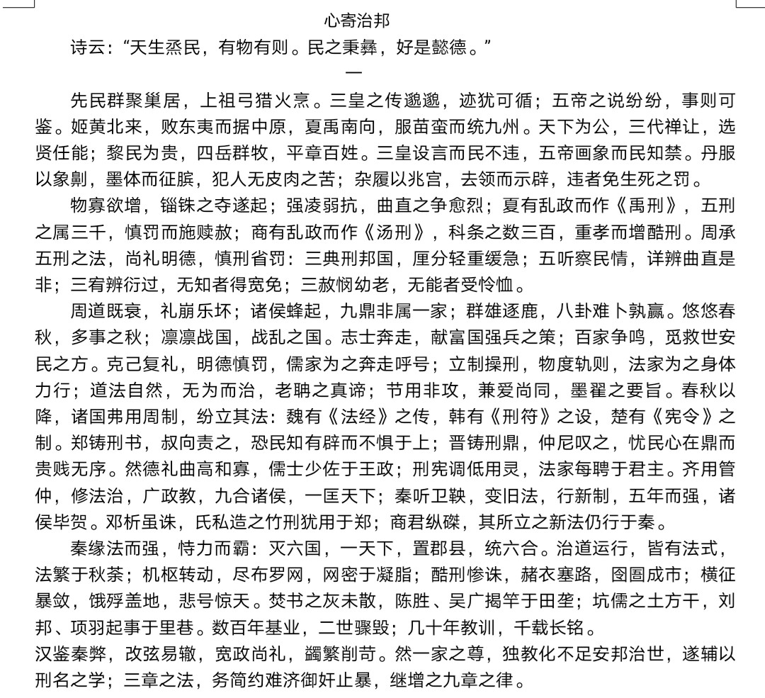 第一段讲述的是从传说时期到秦汉时期的法律史。这一段时期是我国法律史的起源,为后世的法律发展奠定了基础。三皇五帝初设刑罚,夏商遇乱则置刑法,中国远古时期的法制史可以算得上是一部刑罚史。春秋战国,百家争鸣,而法家却适应了时代的发展,获得了各国的重用,秦国更是通过商鞅变法,最终统一六国,建立第一个封建王朝,然而秦朝滥用刑罚,二世而亡。汉承秦制,法制进一步发展。