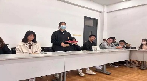 班会伊始,法学2101班几位同学进行了名为《中国少年说》的开场表演,抑扬顿挫的音律、铿锵有力的歌词、刚劲有力的拳体操,调动了现场氛围,展示了少年的青春活力。