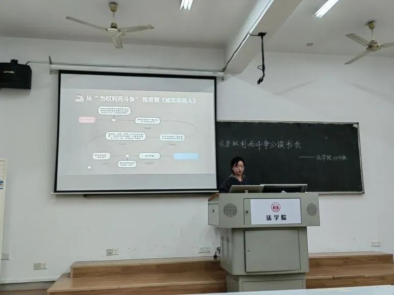 赵泽润同学以话剧《威尼斯商人》中夏洛克起诉安东尼奥的片段引入她的分享。首先,她从“为权利而斗争”的角度分析了《威尼斯商人》,“当权利是法实现的基本机制时,当一个国家法秩序的实现,依赖一个个权利人为自己的权利而进行的不懈斗争时,对权利的尊重就是对客观法秩序的尊重,对权利的破坏就是对法律的破坏,为权利而斗争也就是为法治而斗争。”随后,她指出,一切权利都是从斗争而来,为权利而斗争不仅是个人对自己的义务,更是对集体对国家的义务。接着,她从“为权利而斗争”的角度分析了诺贝尔和平奖得主,伊朗知名作家、记者、律师和人权工作者纳尔吉斯·穆罕默迪的事迹。最后,她提到,对于我国而言,应积极培养公民的权利意识和权利感觉,培养公民树立正确的权利义务观,培养公民以合法的途径实现自身权利。