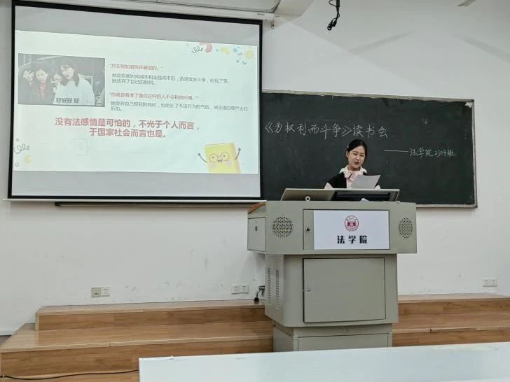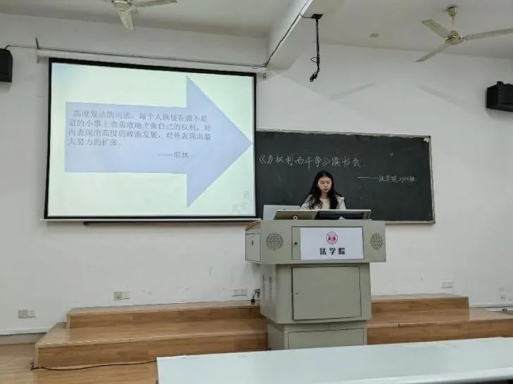 邓敏佳同学首先发言,她围绕“法治中国建设背景下的‘为权利而斗争’”这一主题,从为权利而斗争对国家而言的重要性、中国的法治化颇有成就也前路漫漫、国家和个人都应崇尚“为权利而斗争”的精神并付诸实践这三个方面进行分享。