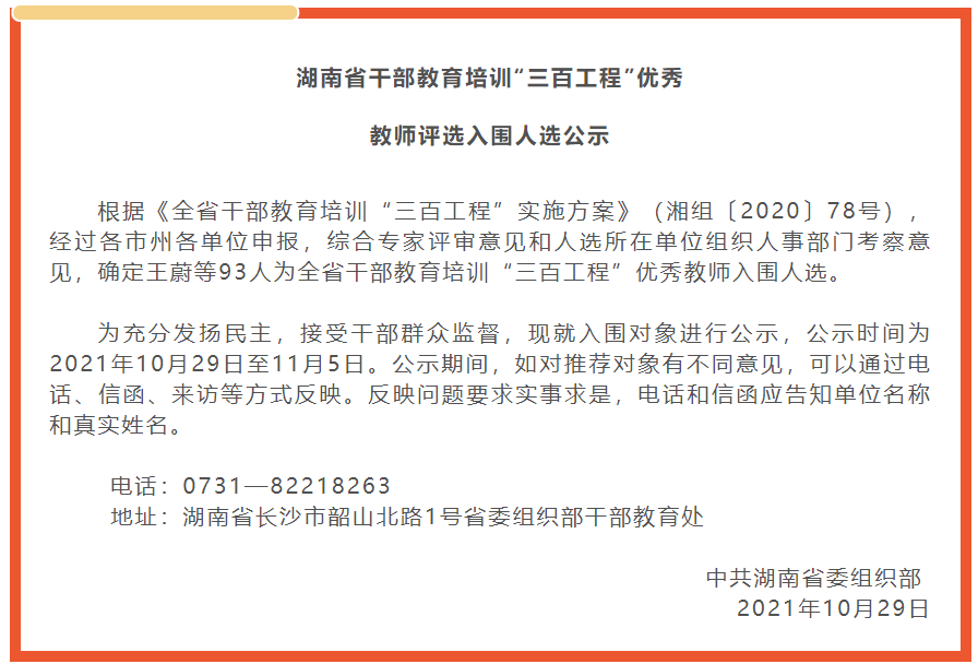 按照中央和省委关于新时代加强和改进干部教育培训工作的部署,决定在全省组织实施干部教育培训“三百”工程,即推选百名优秀教师、评选百门精品党课、遴选百个攻坚克难典型案例(简称“三百”工程)。通过实施“三百”工程,进一步加强全省干部教育培训师资力量、课程质量和资源建设,全面打造政治站位高、课程质量好、联系实际紧的理论和党性教育课程体系。根据《全省干部教育培训“三百工程”实施方案》(湘组〔2020〕78号),经过各市州各单位申报,综合专家评审意见和人选所在单位组织人事部门考察意见,最终在全省一共确定93人为全省干部教育培训“三百工程”优秀教师入围人选,主体为党校系统优秀教师,少部分为其他高校优秀专家。其中91论坛 、湖南师大、湘潭大学等高校各有一名入选者。