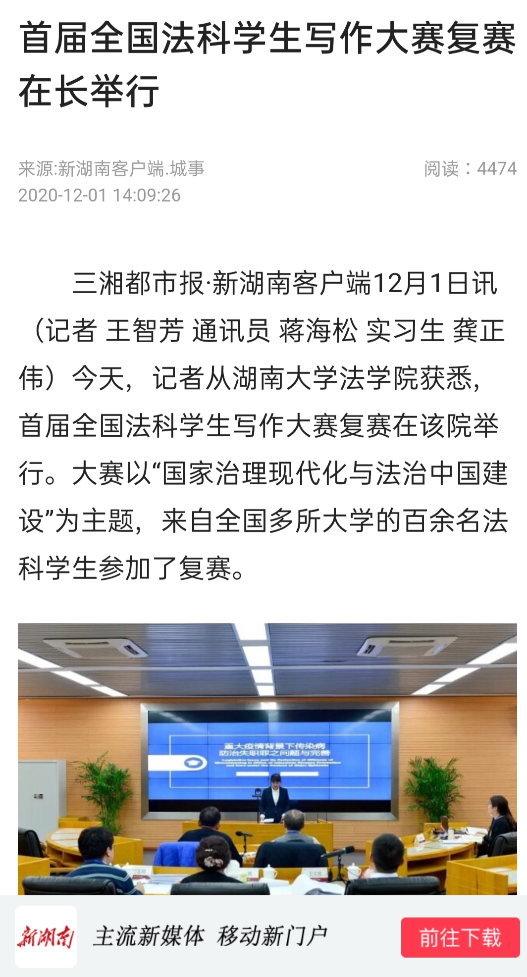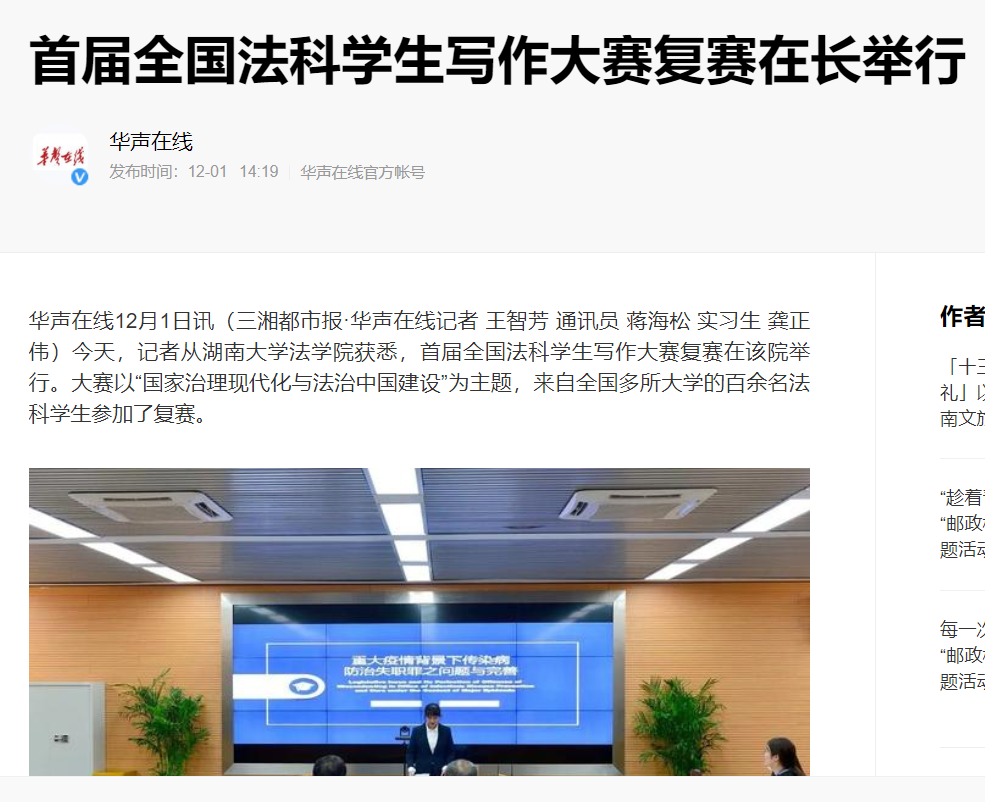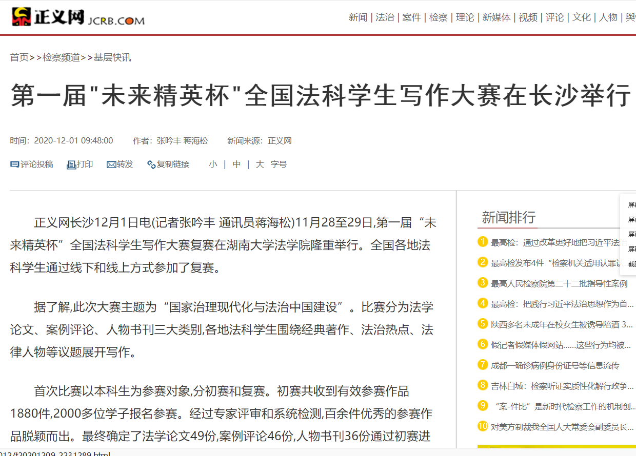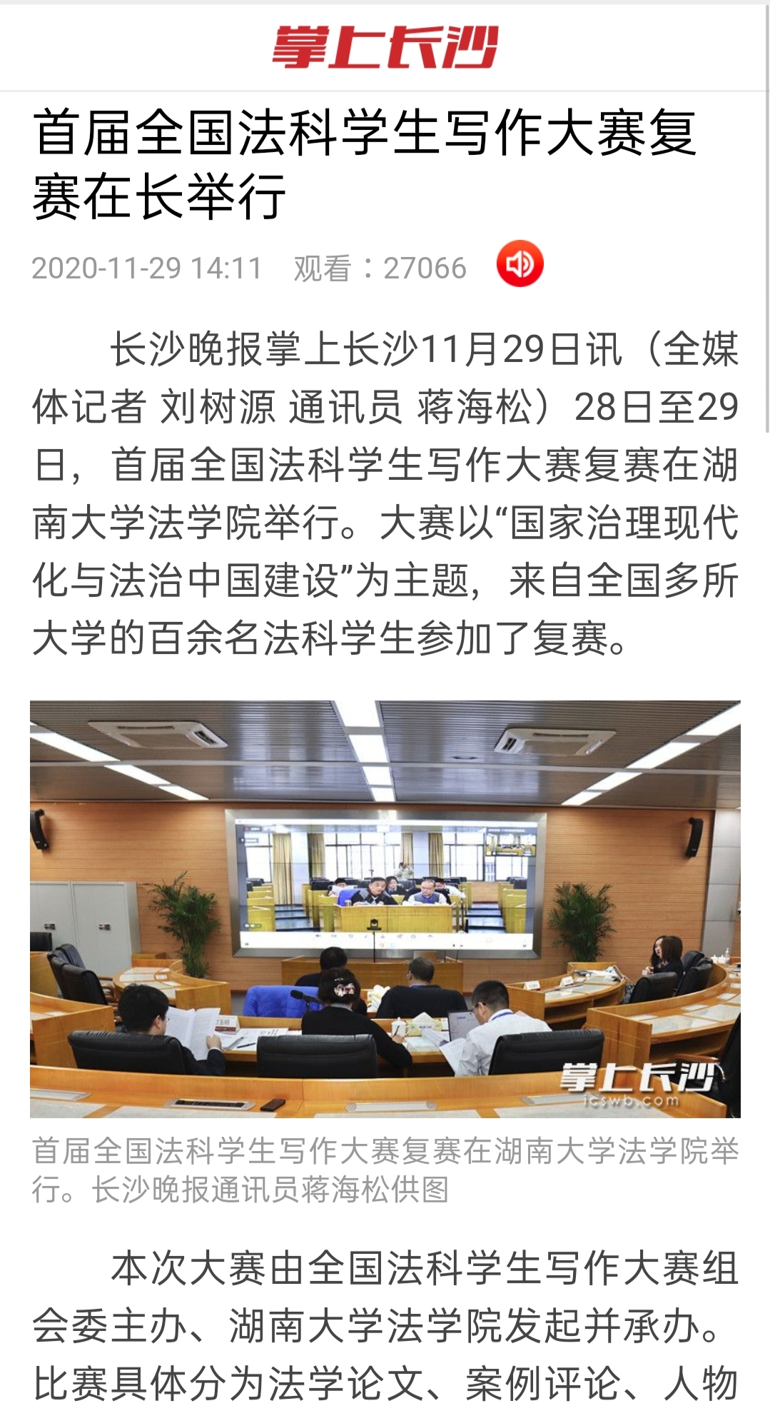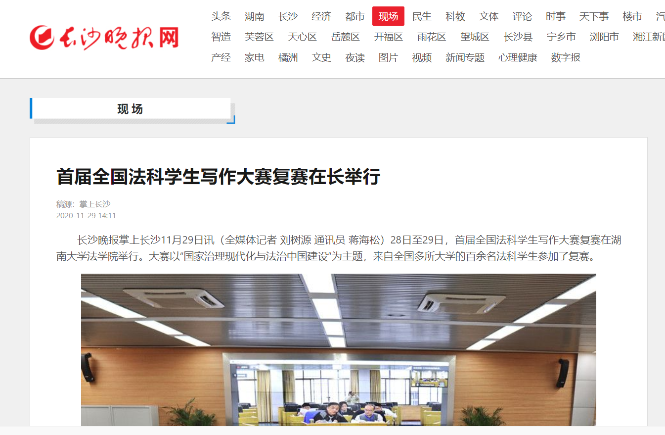 “全国法科学生写作大赛”复赛的成功启动引发全国媒体密集报道。据不完全统计,已有中国新闻网、《光明日报》、法制网、正义网、《法治周末》、《法制周报》、《长沙晚报》、《三湘都市报》、新湖南客户端、红网、腾讯网、华声在线、掌上长沙、91论坛