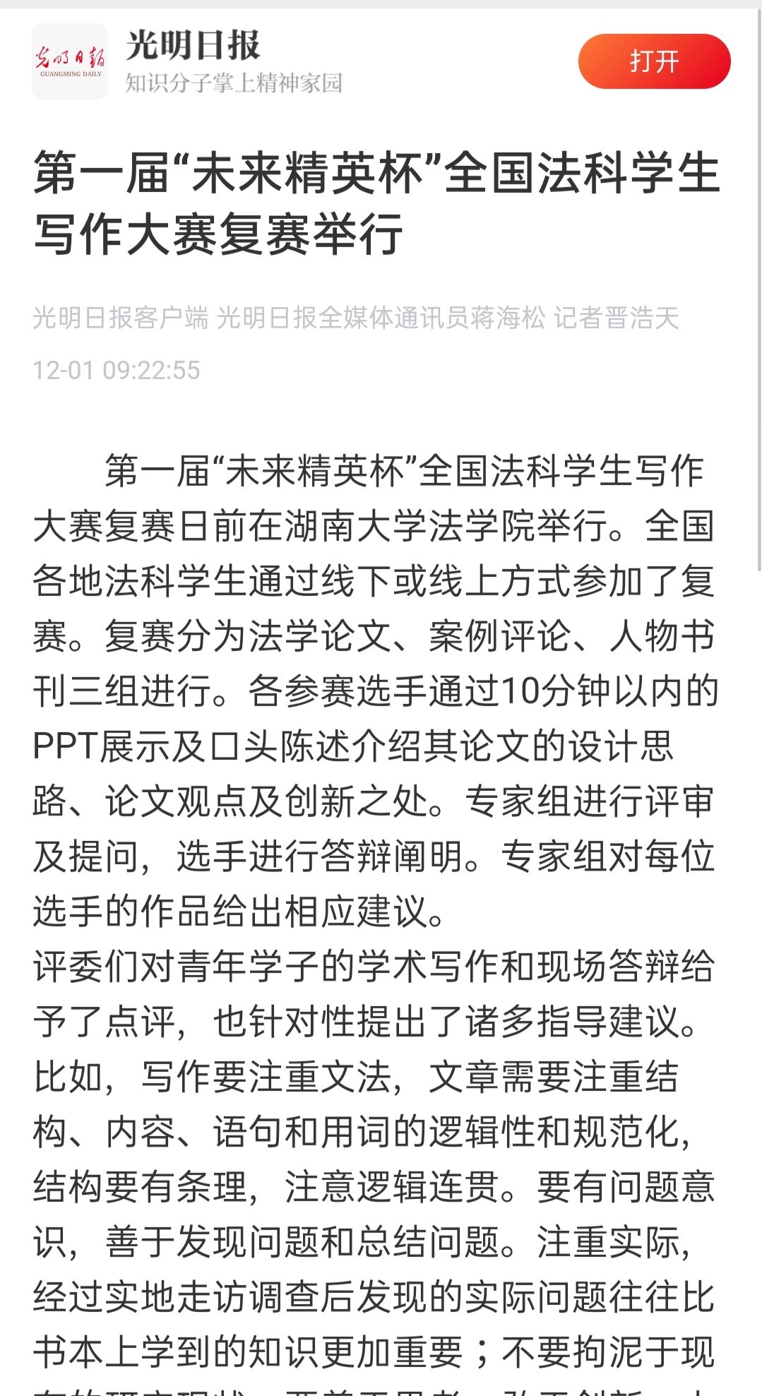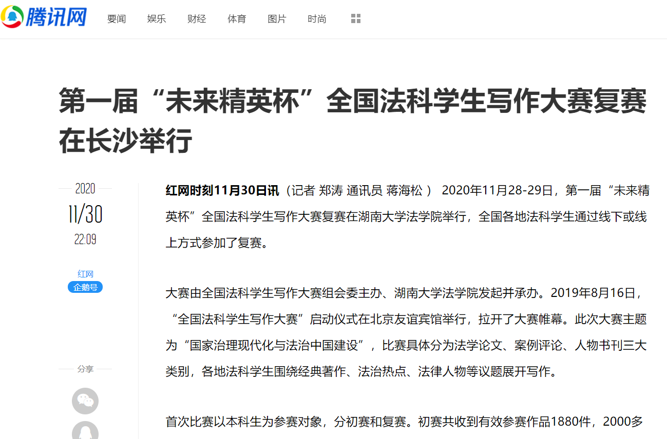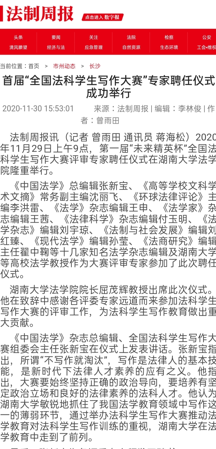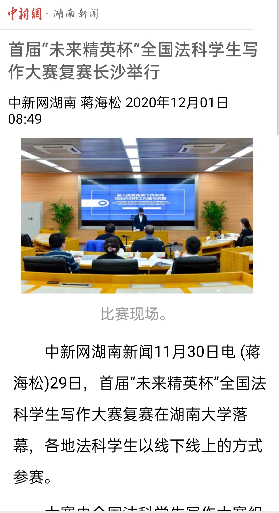 “全国法科学生写作大赛”复赛的成功启动引发全国媒体密集报道。据不完全统计,已有中国新闻网、《光明日报》、法制网、正义网、《法治周末》、《法制周报》、《长沙晚报》、《三湘都市报》、新湖南客户端、红网、腾讯网、华声在线、掌上长沙、91论坛