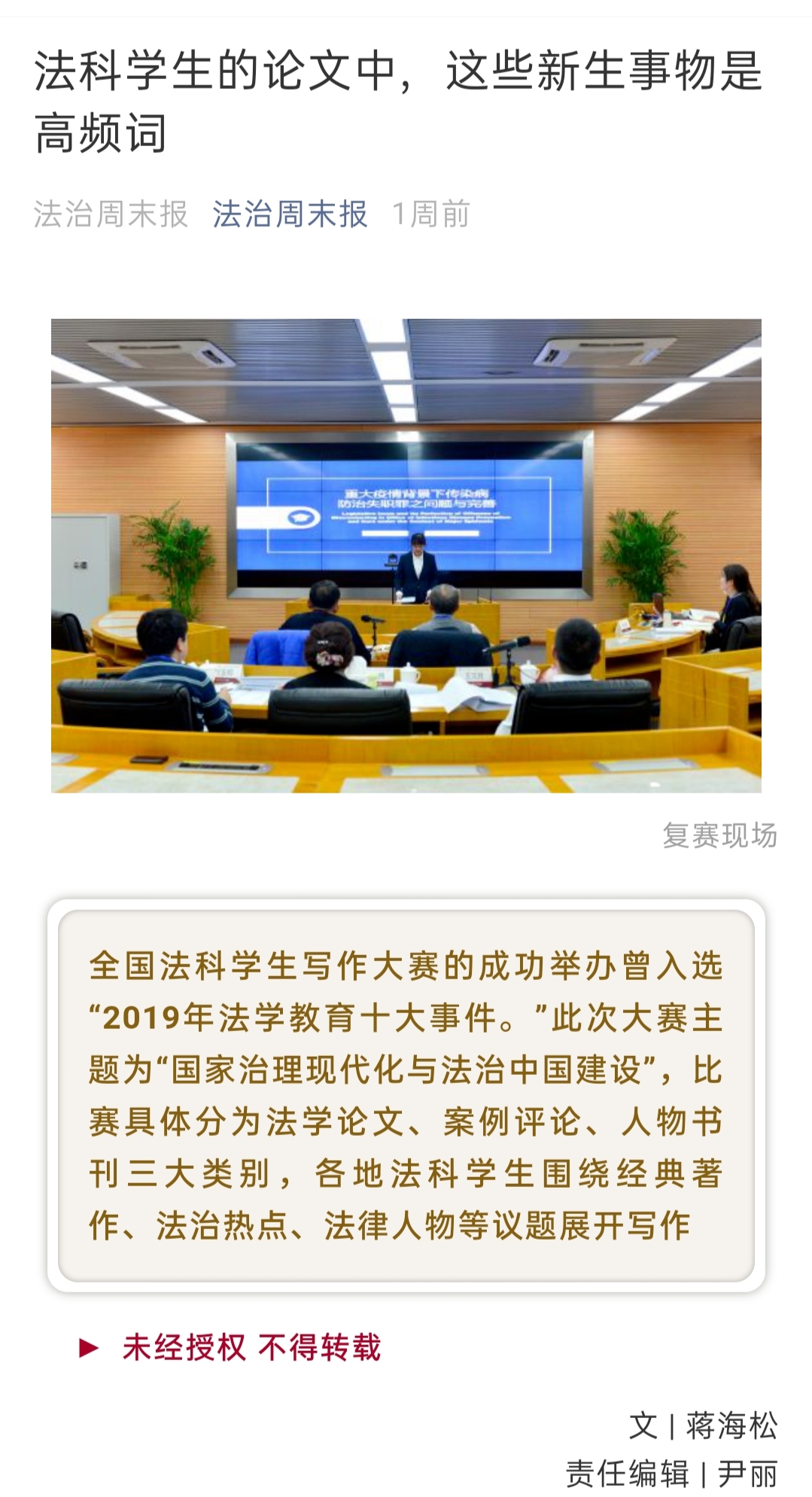 新闻网等全国二十多家媒体的报道。《法制周报》连续推送了几条报道,《法治周末》推出了题为《法科学生的论文中,这些新生事物是高频词》长篇学术通讯。